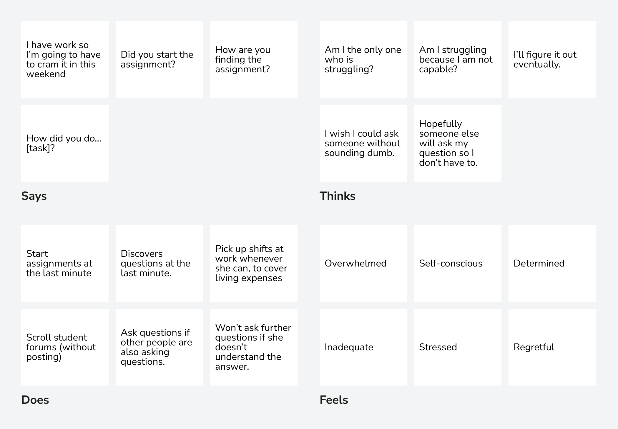 These channels often fell short of their purpose. Teacher open hours were helpful but not frequent enough to provide support when students needed it most, and sometimes clashed with other classes or commitments. Many students hesitated to post on Slack or Blackboard for fear of being judged for asking a “dumb” question, or revealing last-minute work. Email communication with teachers, while available, also varied in effectiveness, with slow response times and frequent misunderstandings due to missing context.