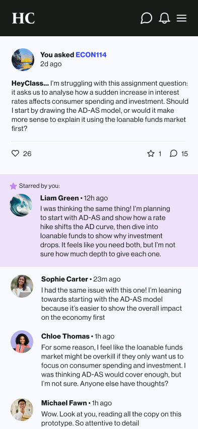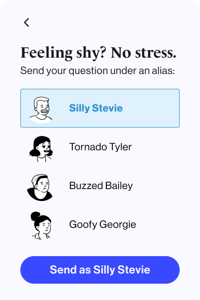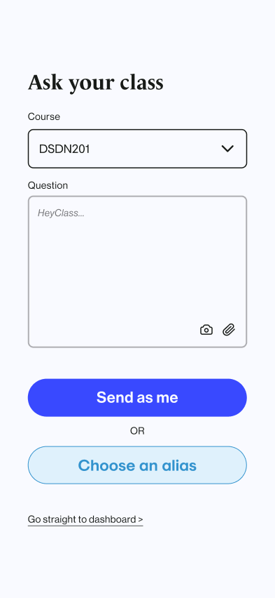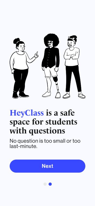 Heyclass is a platform designed to reduce the pressure and stigma around asking questions. It encourages question-asking from the moment users enter the platform, and allows the self-conscious student to ask questions using a playful alias.