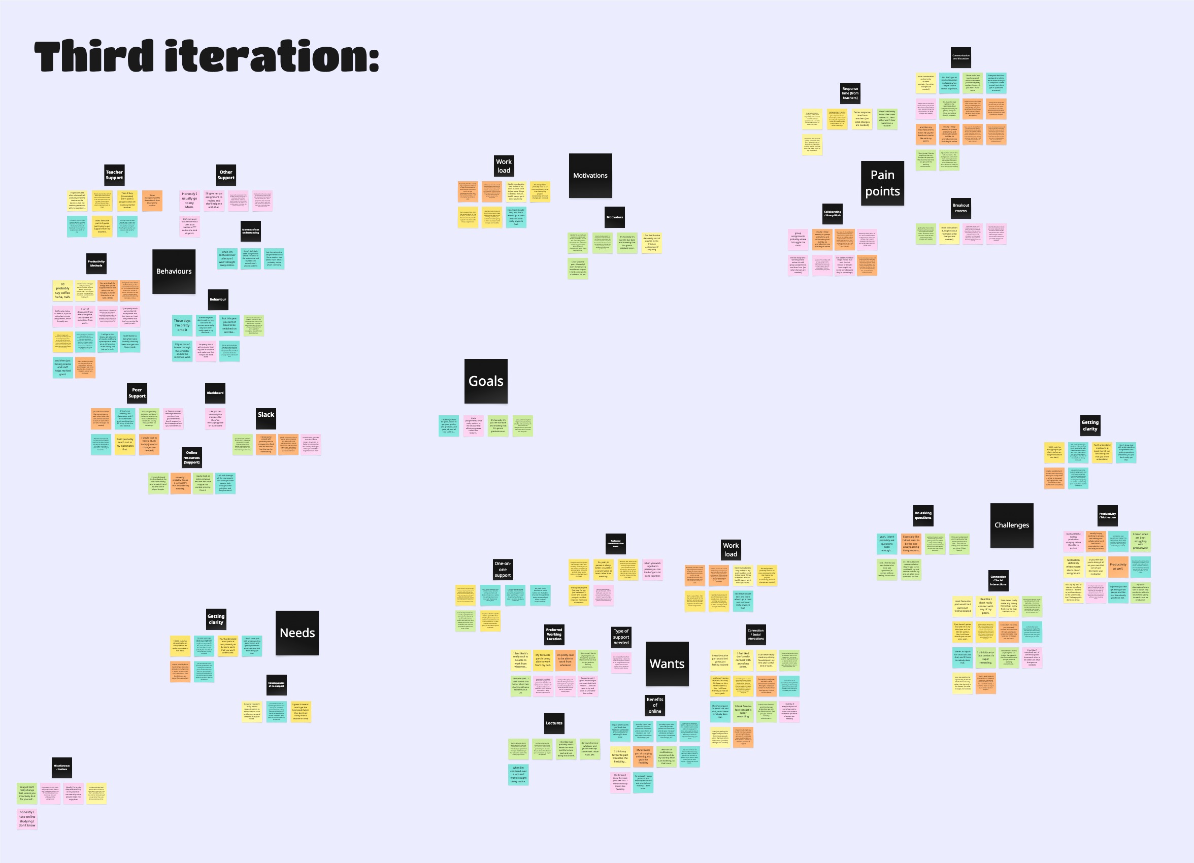 I conducted a thematic analysis of the interview data to identify patterns in students’ behaviours, pain points, needs, and goals. Through several rounds of refinement, I deepened my understanding of the emerging trends.