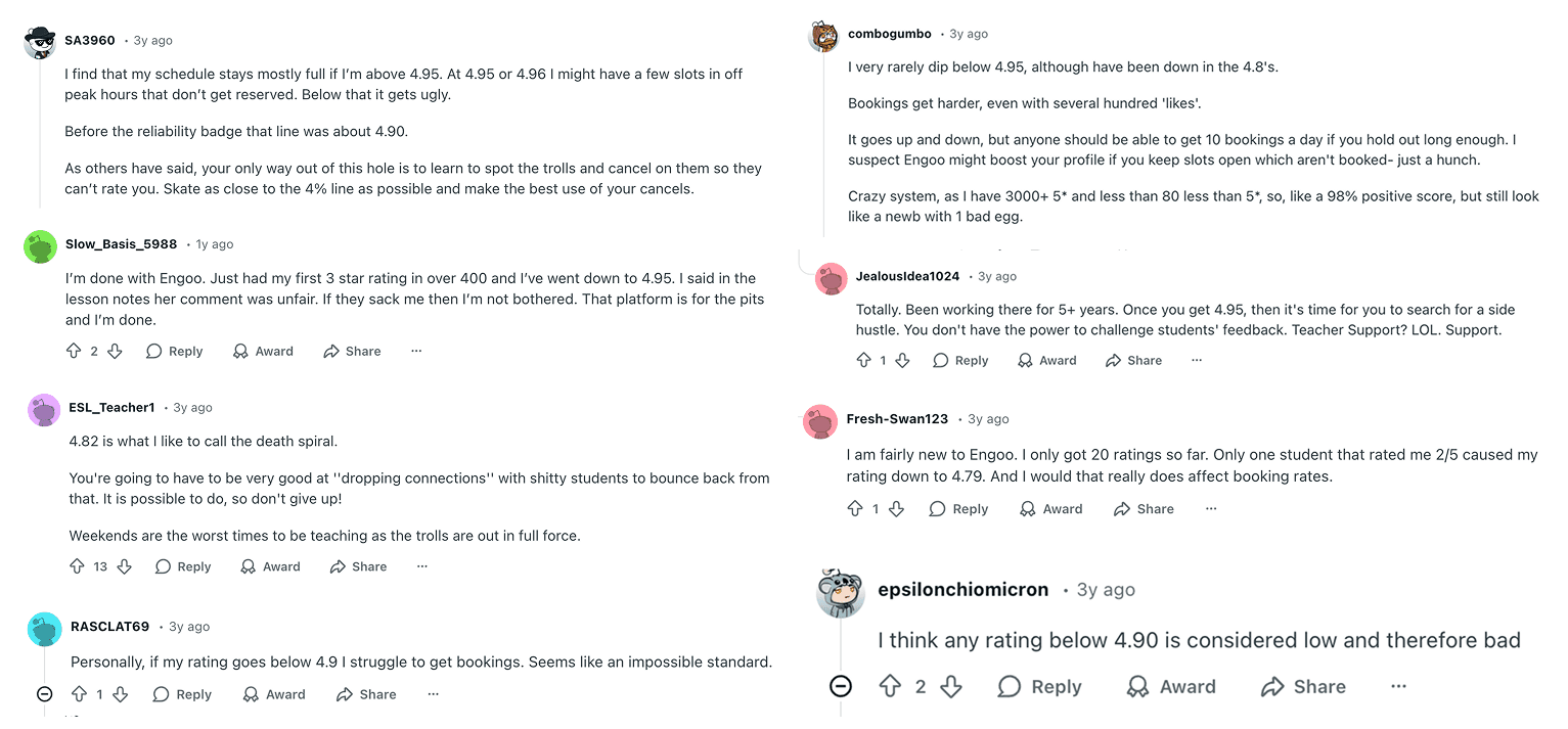 On Engoo, this becomes problematic as tutor search results are ranked solely by rating, making it the only signal of quality. Tutors have raised concerns that this system does not account for differences in student preferences, and that even small variations in reviews can have a disproportionate impact on their visibility and access to bookings.
